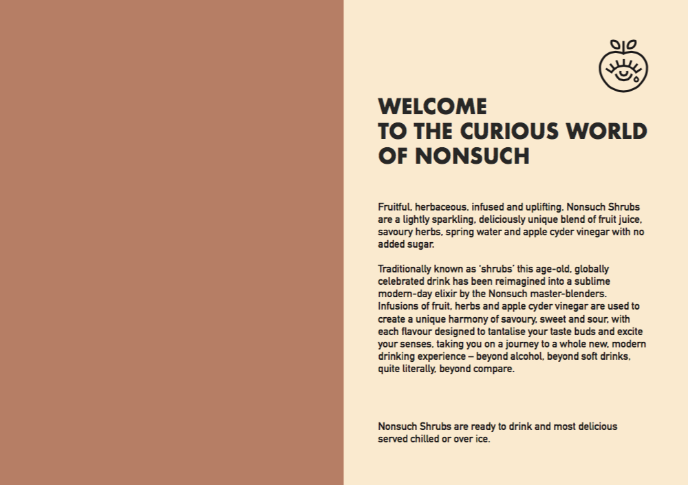 I began working with Nonsuch right before their launch to market in January 2018, helping them to develop their brand identity, tone of voice, taglines, social media copy, content and aesthetic, packaging design, brand copy, menus, press releases, brochures, recipe cards, on-trade and off-trade toolkits, design and comms for live events and beyond.