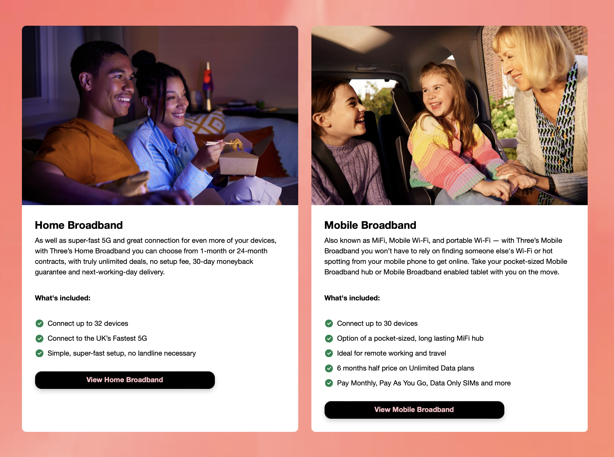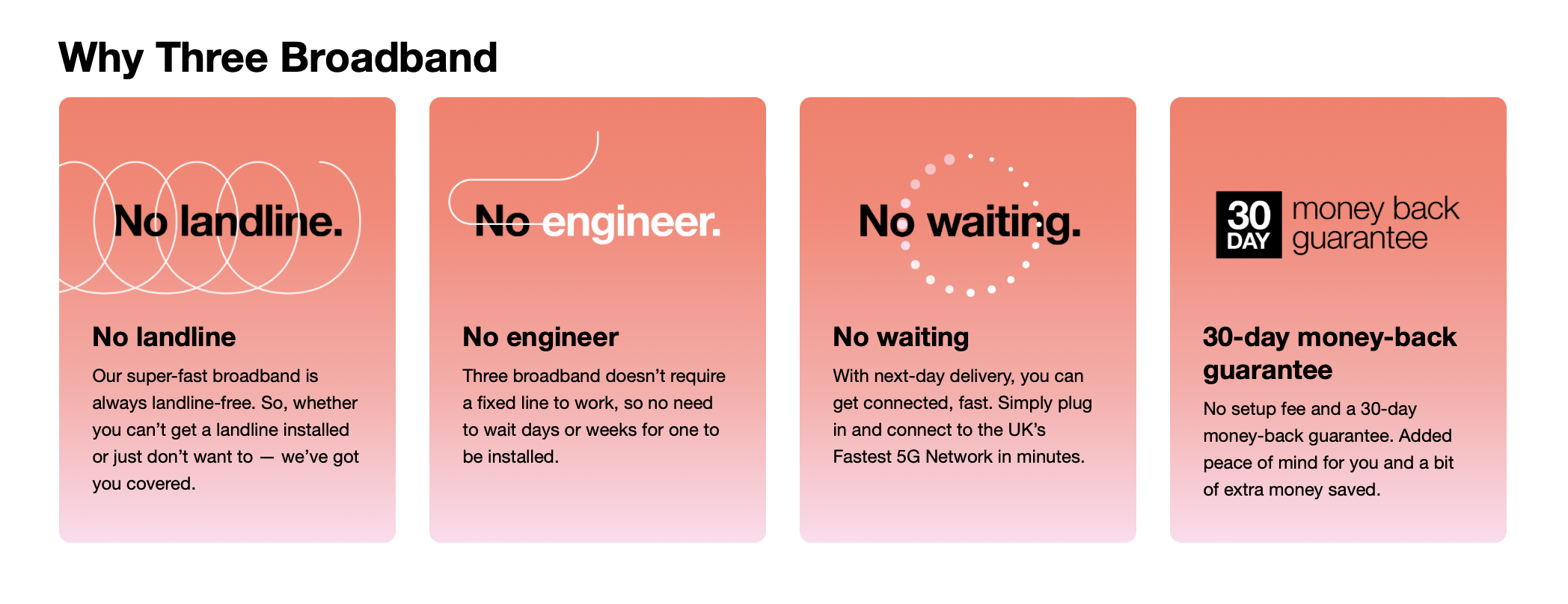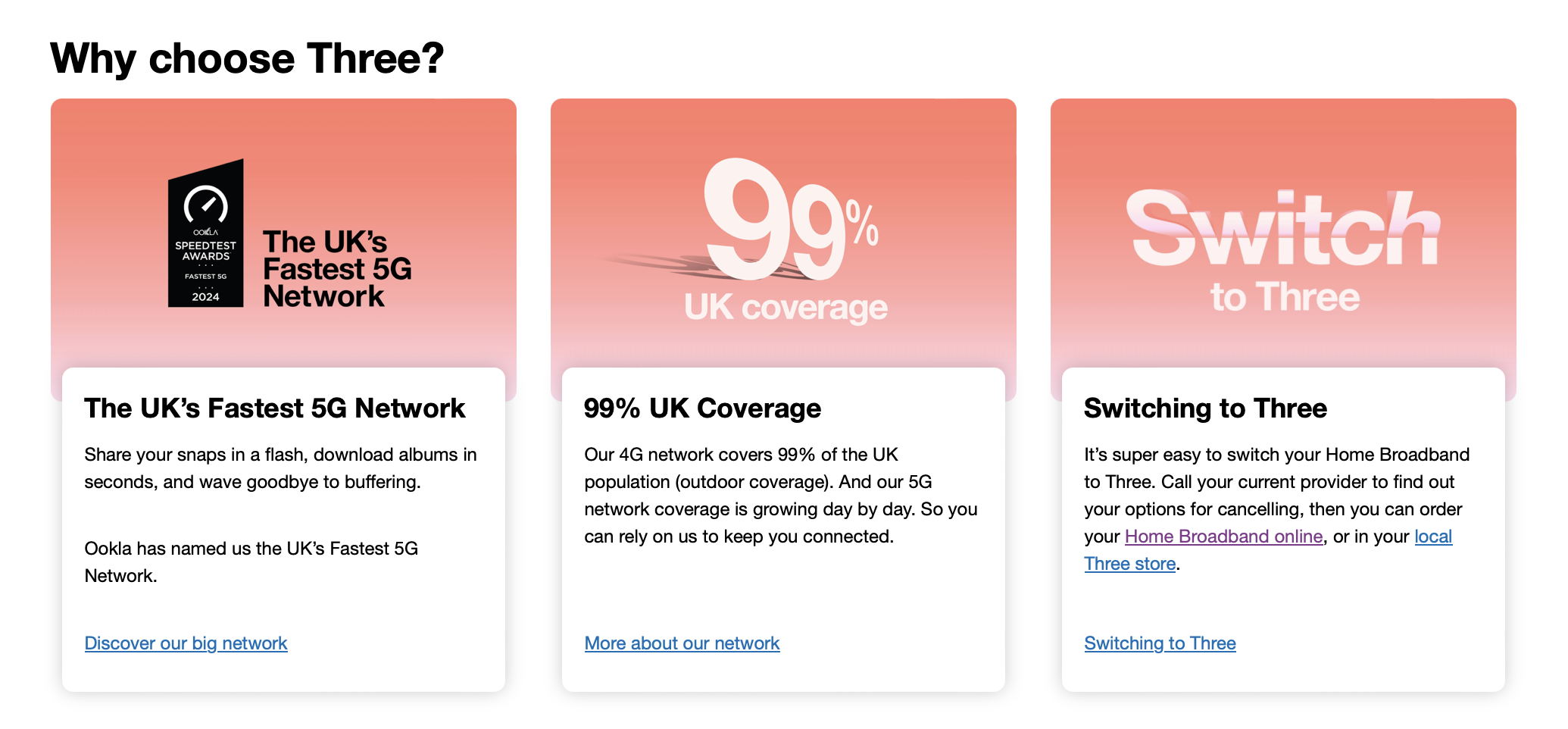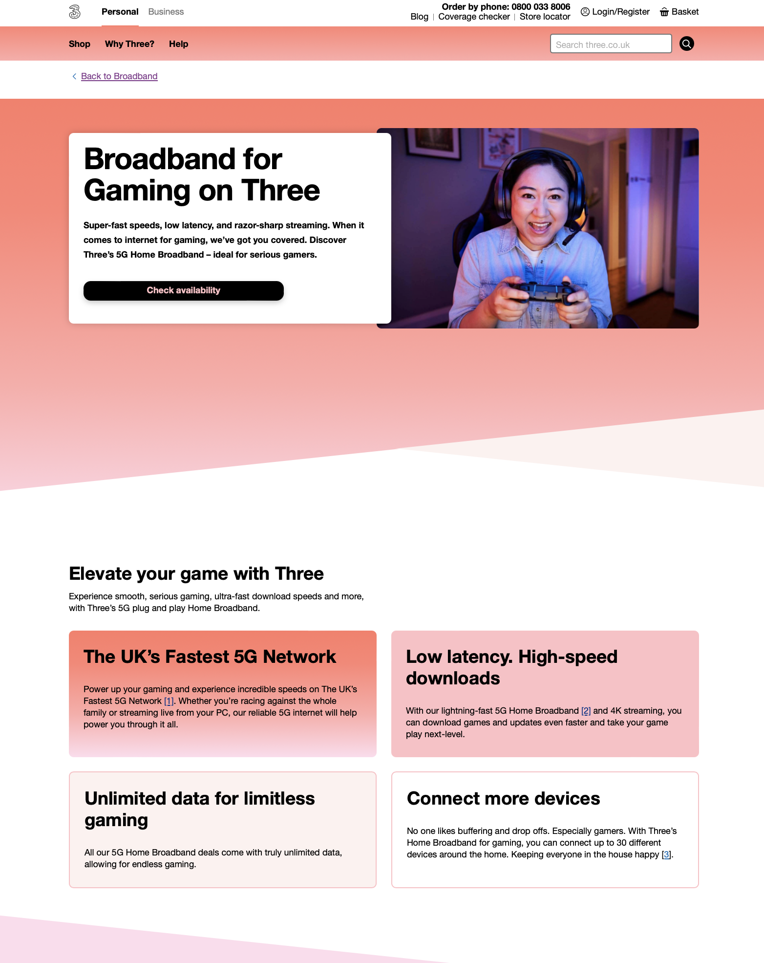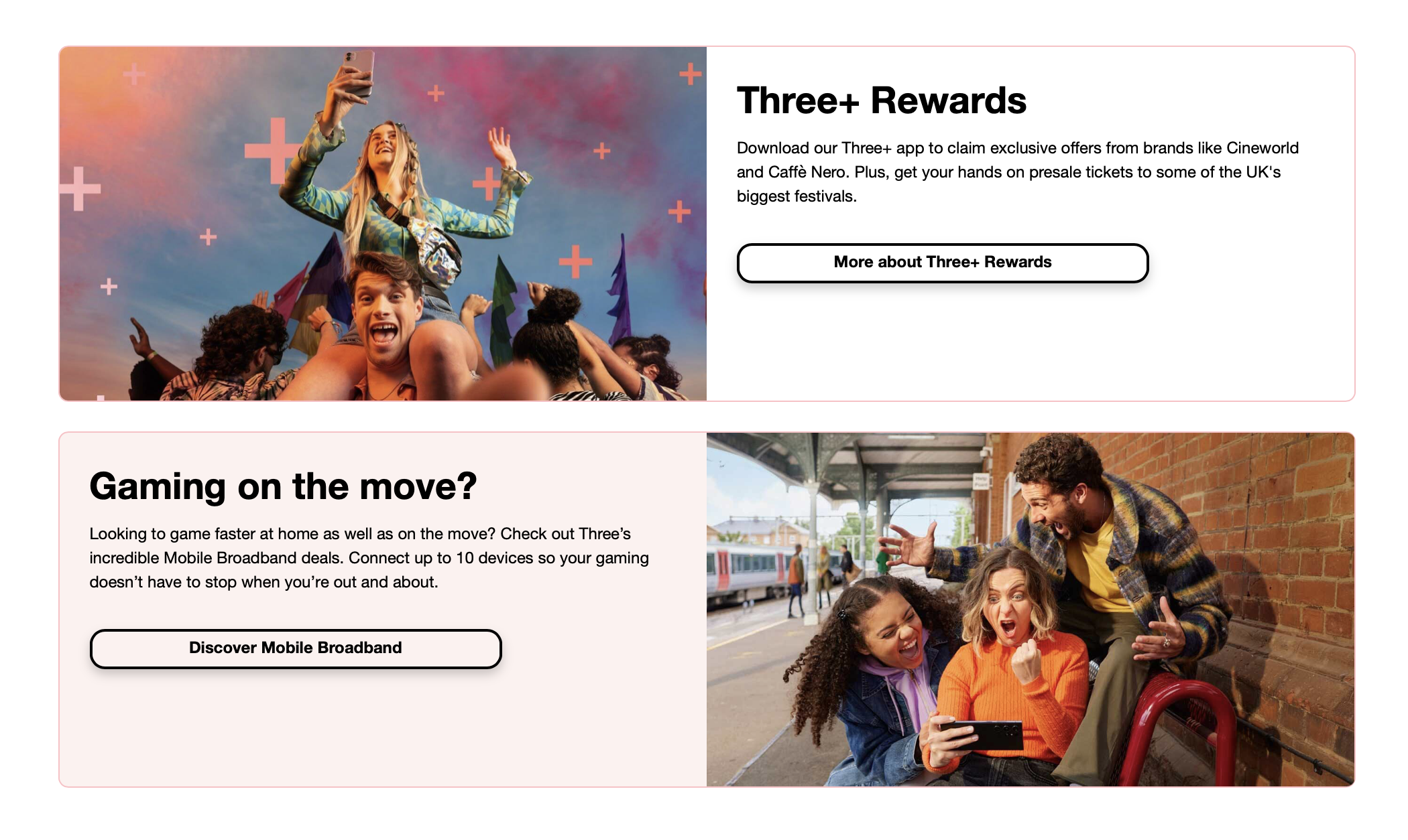 Creative copy for Three’s in-house creative agency, Generation, including TOV development, OOH, social, in-store, online advertising, packaging, scripts, presentations and more. I also worked for Three’s digital and CRM team delivering webpage copy, product descriptions and UX/UI copy for their app and Three.co.uk.